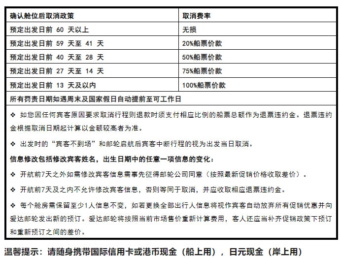1)若遇不可抗拒因素(如:遇臺風等),郵輪公司有權改變行程及縮短港口停留時間,由此所產生的損失我司及郵輪公司概不負責。