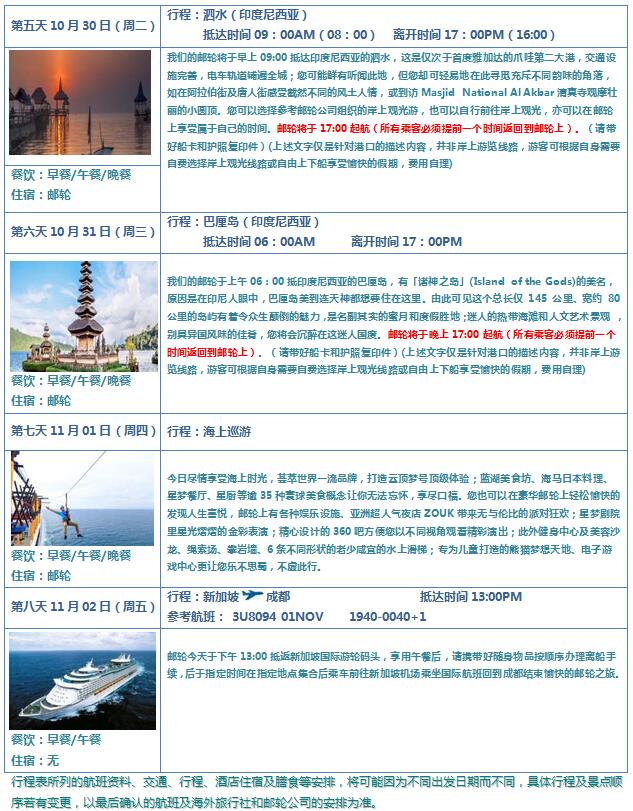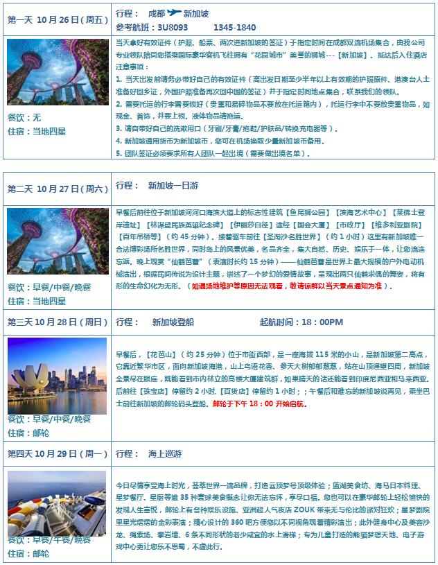 團(tuán)隊(duì)成都出發(fā)時(shí)間:2018年10月26日 郵輪當(dāng)?shù)貑⒑綍r(shí)間:10月28日