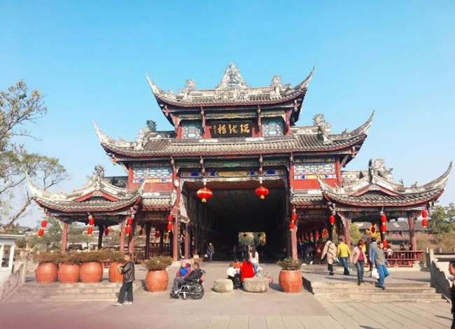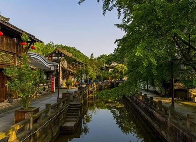 岷江的支流味江流經地勢平緩的街子鎮口,形成一泓碧潭——龍潭。古鎮水系發達,地下水豐富,石板路兩側及屋前院后,常年清水不斷,因而有“川西水鄉”之名。“青城后花園”之稱。景區屬亞熱帶濕潤氣候,年平均氣溫15.9℃,盛夏氣溫低于成都市區4—5℃,全年均適宜旅游。